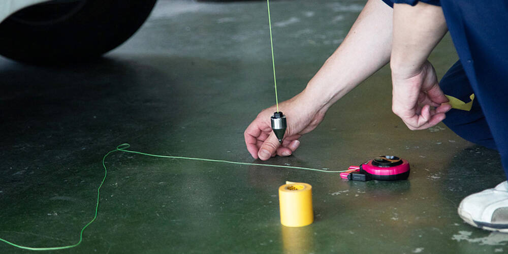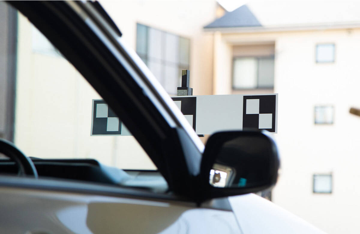 ターゲットと呼ばれるボードを車両に対して適正な距離や高さを計測し、中心に設置します。